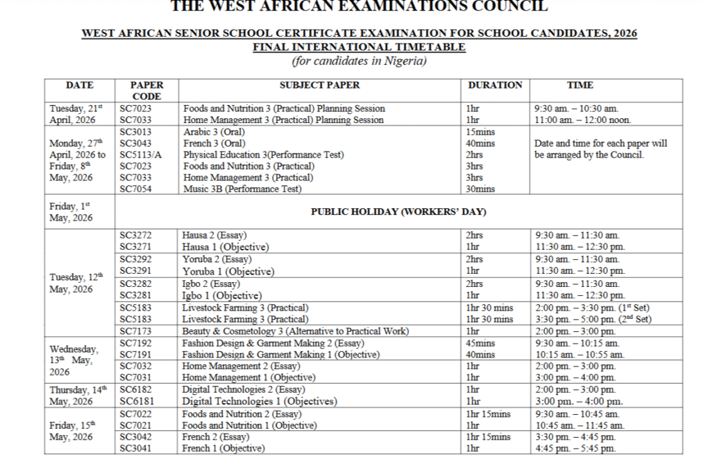 The West African Examinations Council (WAEC) has officially announced the timetable for the 2026 West African Senior School Certificate Examination (WASSCE) for school candidates.